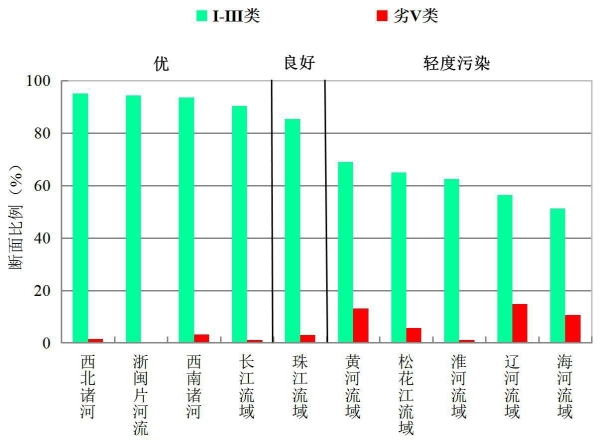 2019年1-6月,长江、黄河、珠江、松花江、淮河、海河、辽河等七大流域及西北诸河、西南诸河和浙闽片河流Ⅰ-Ⅲ类水质断面比例为77.9%,同比上升4.6个百分点;劣Ⅴ类为4.5%,同比下降2.7个百分点。主要污染指标为化学需氧量、氨氮和五日生化需氧量。其中,西北诸河、浙闽片河流、西南诸河和长江流域水质为优,珠江流域水质良好,黄河、松花江、淮河、辽河和海河流域为轻度污染。