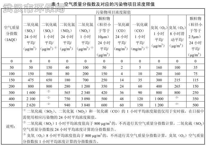 1、对照各项污染物的分级浓度限值(表1),以六项污染物的实测浓度值(其中PM2.5、PM10为24小时平均浓度)分别计算得出空气质量分指数(Individual Air Quality Index,简称IAQI);
