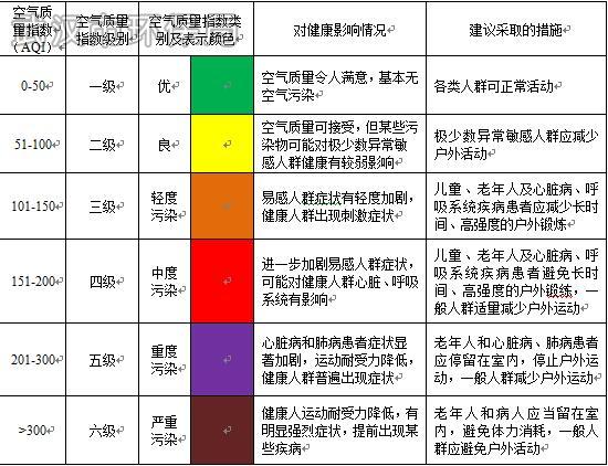 AQI共分六级,从一级优、二级良、三级轻度污染、四级中度污染,直至五级重度污染、六级严重污染,空气污染指数分别划分为0-50、51-100、101-150、151-200、201-300和大于300六档。其数值越大、级别和类别越高、表征颜色越深,说明空气污染状况越严重,对人体的健康危害也就越大。市民看AQI时,不需要记住AQI的具体数值和级别,只需要注意六种评价类别和表征颜色。当类别为优或良、颜色为绿色或黄色时,一般人群都可以正常活动;当类别为轻度污染以上,颜色为橙色、红色、紫色或褐红色时,各类人群就需要关注建议采取的措施,在安排自己的生活与出行时作为参考。