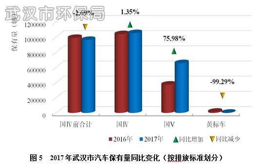 与2016年相比,武汉市老旧机动车(国Ⅳ前排放标准)保有量下降2.69%,其中黄标车保有量减少99.29%;同比变化情况见图5。