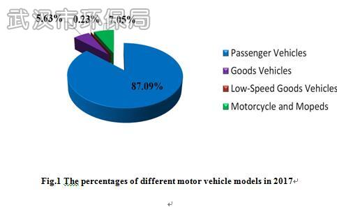 The total number of motor vehicles in Wuhan was 2878541[1], according to the study in the year 2017; it has increased by 10.26% compared to the number in 2016. The total number of passenger vehicles and goods vehicles was 2669194, which showed an increase of 11.27% compared those with 2016. The number of low-speed goods vehicles and motorcycles was 6526 and 202821 respectively in 2017, which were 1.89% and 1.20% reduction compared with that of the year 2016. The percentage wise distribution of motor vehicle models is shown in Fig. 1.